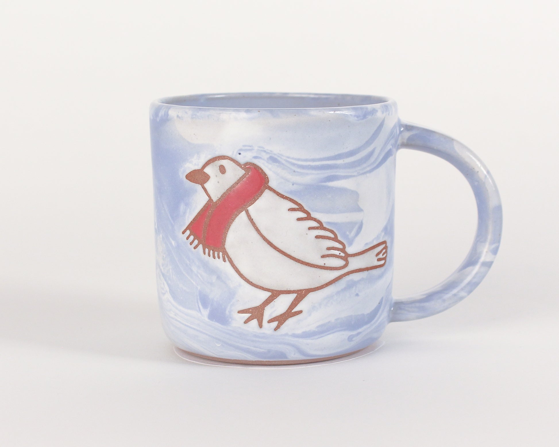 Hand-thrown stoneware mug. Each mugs holds about 14-16fl oz and is dishwasher safe but not microwave recommended. The bird is on both sides of the mug and the mug is made with non-speckled clay.