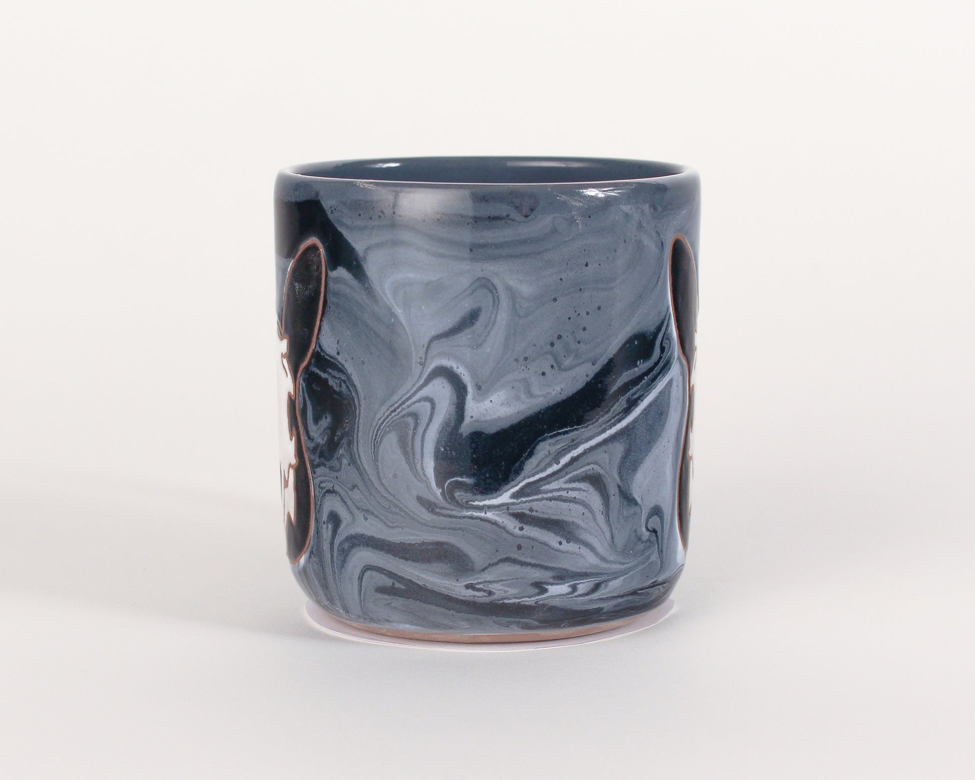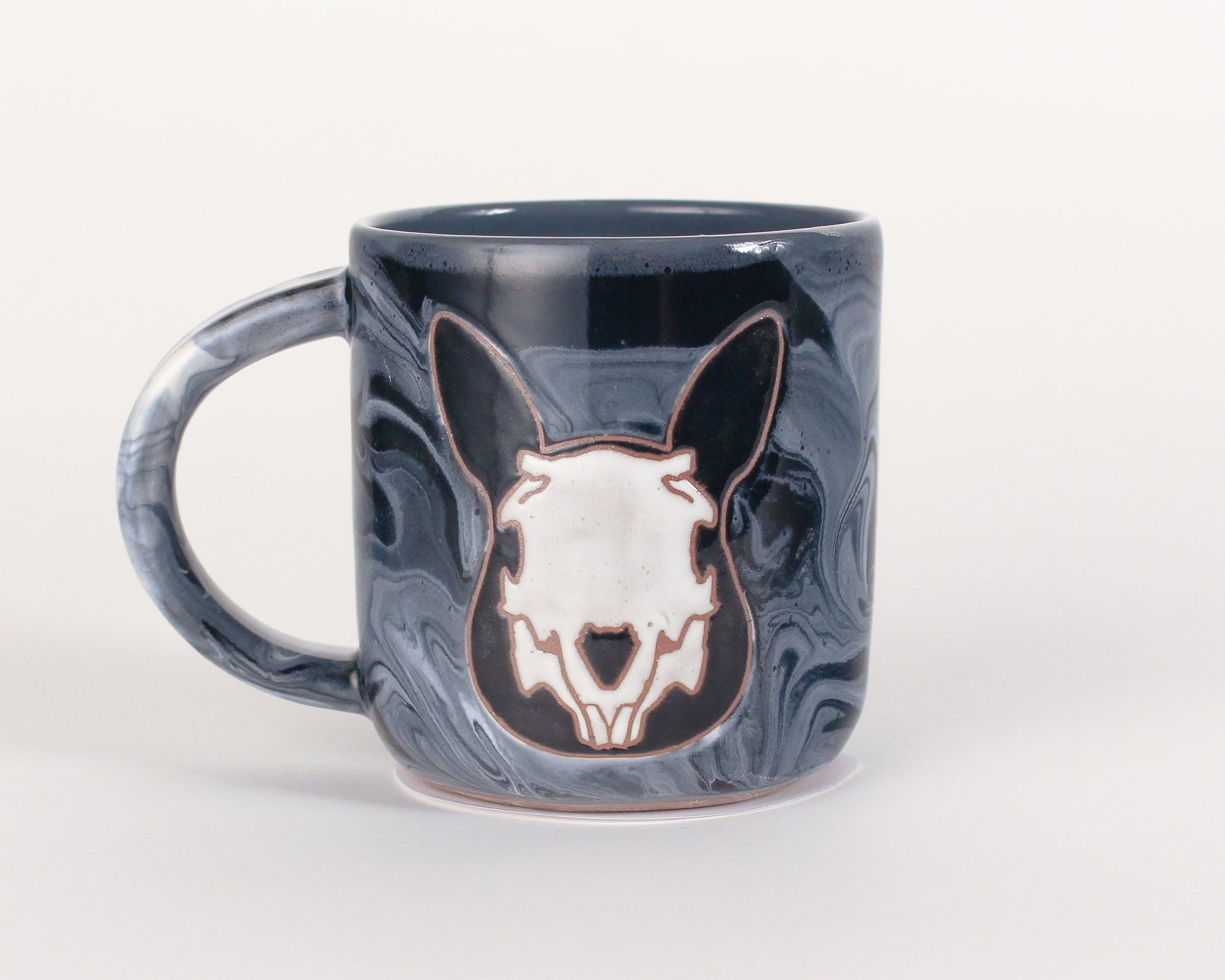 Hand-thrown stoneware mug. Each mugs holds about 14-16fl oz and is dishwasher safe but not microwave recommended. The bunny skull is on both sides of the mug and the mug is made with non-speckled clay.
