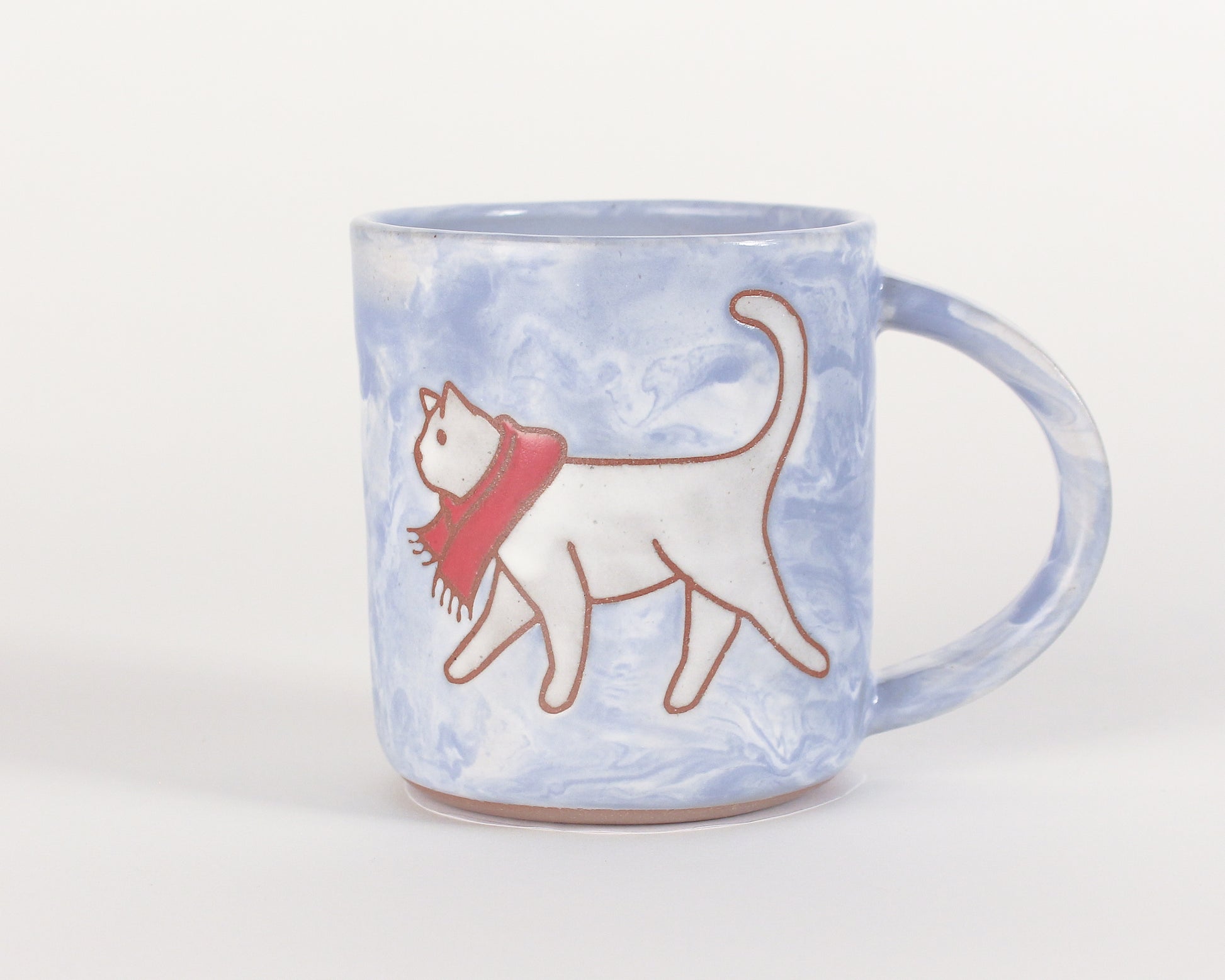 Hand-thrown stoneware mug. Each mugs holds about 14-16fl oz and is dishwasher safe but not microwave recommended. The cat is on both sides of the mug and the mug is made with non-speckled clay.