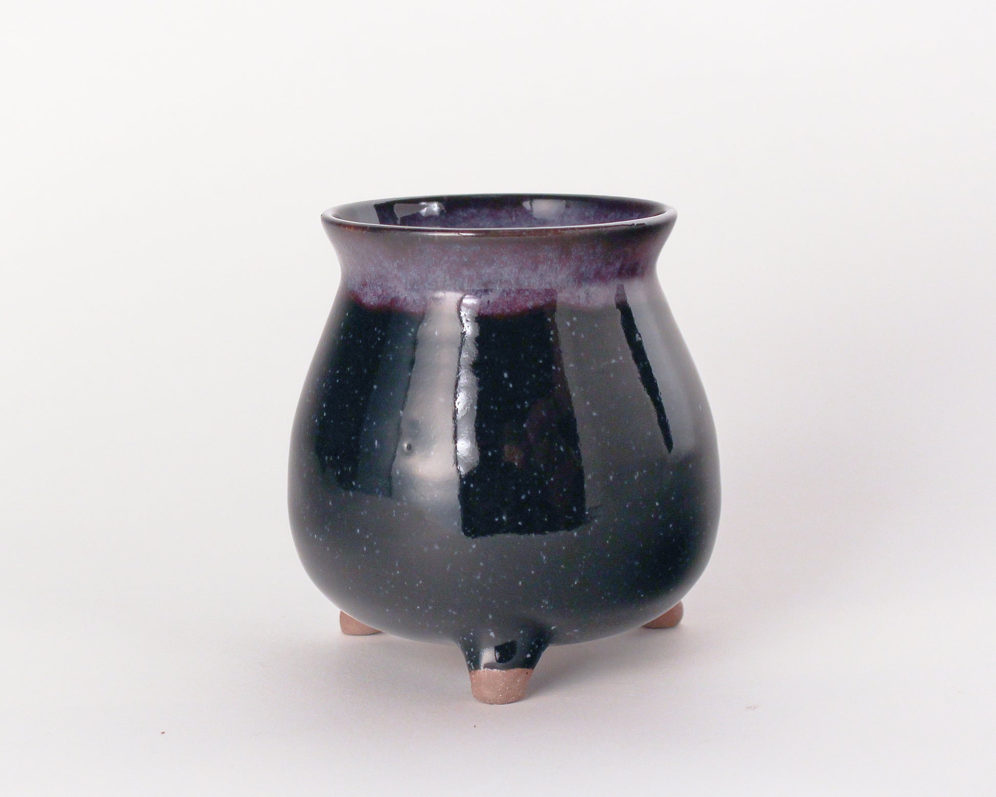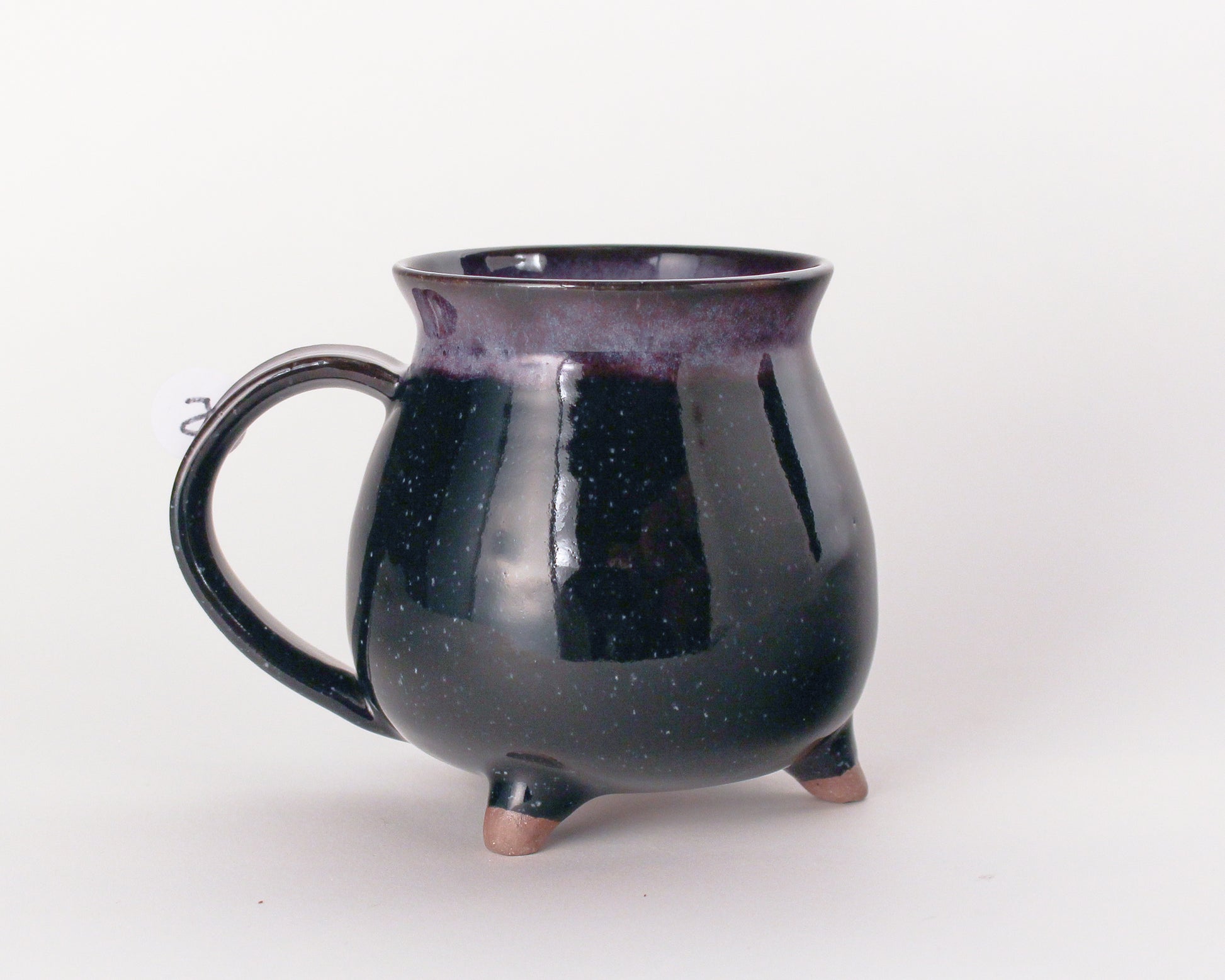 Hand-thrown stoneware mug. Holds about 15fl oz and is dishwasher safe but not microwave recommended. Cauldron style mugs have 3 feet. Mug glazed black with small white specks and a purple rim that also goes into the mug.